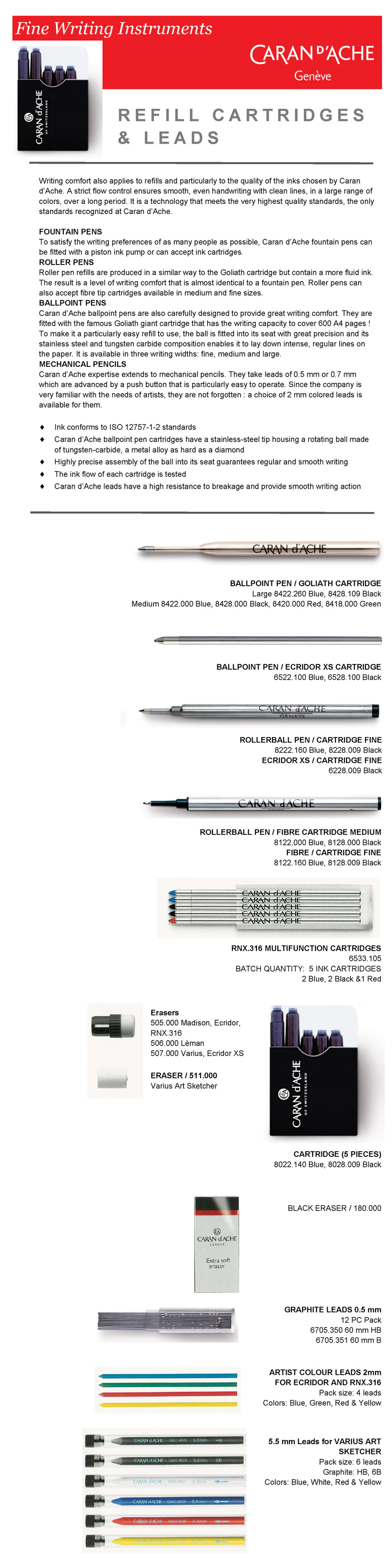 Caran d'Ache Fine Writing Cartridges, Leads & Erasers